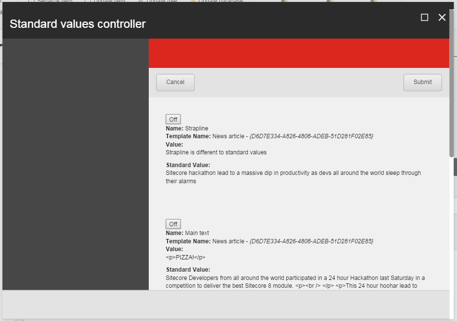 We agreed that with just 24 hours to deliver, we had to aim for something with achievable core functionality. This is where the idea to improve resetting Items to standard values came in. The idea was about giving more flexibility to allow fields of an Item to be reset independently as opposed to the core functionality of resetting the whole item. After User Story definition and sprint planning we decided that the Module would exist within a SPEAK Modal opened by a custom button in the Content Editor ribbon. It would give relevant information on each field; originating Template, current value, standard value etc even working with multiple Base Templates.