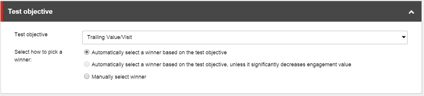 The Test Objective is used to measure how successful each Experience is. Therefore the Objective needs to be something that can be affected by users going through the Test Experience. Perhaps the Test affects users journey through the sales funnel ultimately leading to an order or maybe the test changes the content and layout of the account creation page. The former’s Test Objective would be the default Trailing Value per Visit and the latter’s would be Registrations.