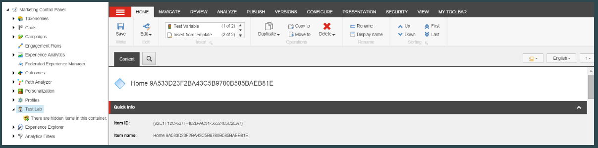 When a Test is created an Item called a Test Definition Item is created to contain the attributes and is stored under the Test Lab in the Marketing Control Panel.