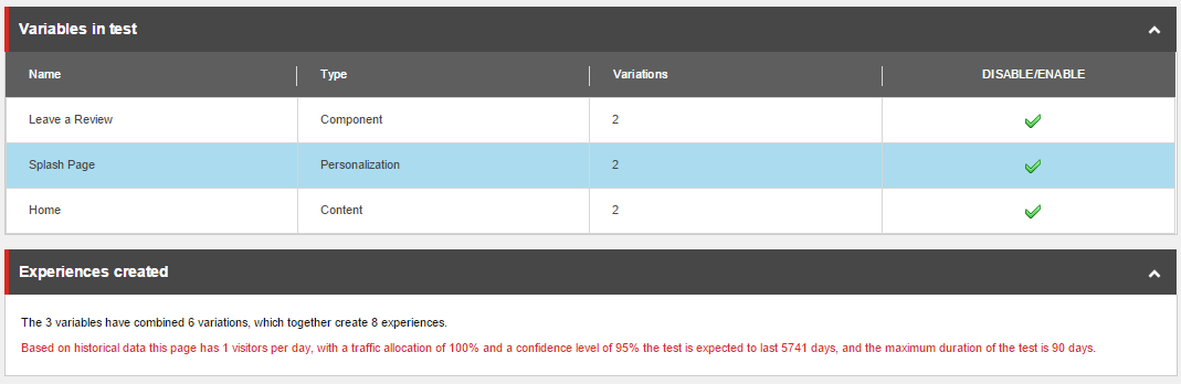 Multivariate Tests will display all Experiences which will be tested and the variables that created them. At this point you can choose to Enable or Disable a variable from the test if you so wish. From my example eight Experiences will be tested.