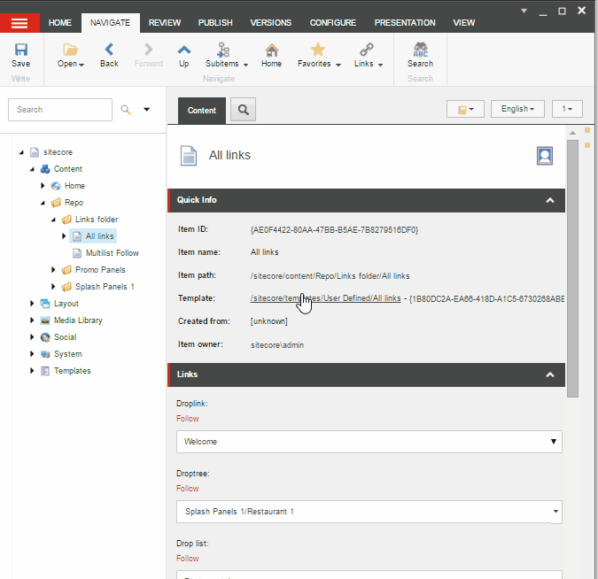 The module makes use of Sitecore’s Menu item template which is added beneath the Field Type definition Item in the Core database. This displays the Follow link above each field when added to an Item. On the click event a Custom Command is made passing the field’s Target value.